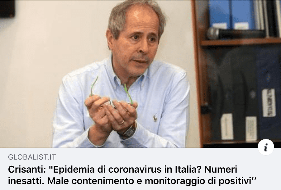 Per chi si domandava perché la Lombardia fosse più colpita delle altre regioni, Crisanti ha dato la risposta: i dati non sono corretti. Finalmente anche Borrelli sta dicendo che gli infetti sono 10 volte tanto quelli censiti (se non addirittura 100 volte tanto, secondo Ilaria Capua). Se allora abbiamo 630.000 infetti e non i 63.000 dei dati riferiti ieri alle 18, ne consegue che la mortalità non è del 9% ma dello 0,9% (se non addirittura dello 0,09%). Rimettere i dati – fino ad ora “drogati” – al loro posto può aiutare a capire come agire: non è questione di risorse ma di metodo. Agire sul territorio e non solo negli ospedali, dice Crisanti. Isolamento selettivo e concentrico.