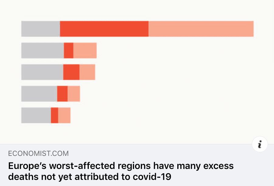 Leggo sull’Economist: “Siccome i dati sui contagi non sono affidabili, gli scienziati adesso si sono focalizzati sui decessi. Le nuove statistiche (“nuove statistiche”?) suggeriscono che il dato della mortalità (morti rispetto alla popolazione, da non confondere con la letalità = morti rispetto a contagiati, ndr) potrebbe ridimensionare l’entità dei danno”.