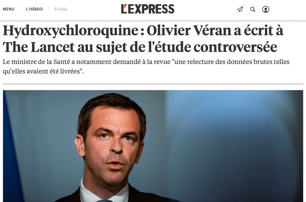 Ok, non ne possiamo più di parlare di Coronavirus. Sono d’accordo. Però questo breve articolo comparso sul settimanale francese L’Express dice una cosa importante: che tre dei quattro autori, che il 22 maggio su Lancet avevano stroncato l’idrossiclorochina come cura contro il Covid, hanno ritrattato (mentre qui in Italia stiamo ancora aspettando notizie sull’uso del plasma…).