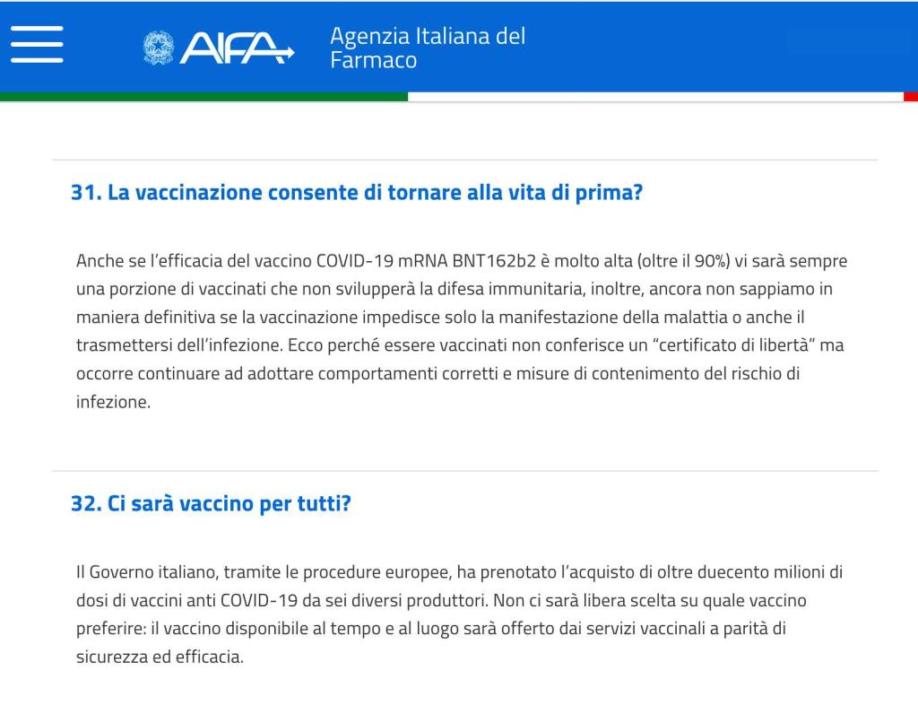 Lo scorso 23 dicembre l’Aifa (Agenzia Italiana del Farmaco, che da pochi giorni ha il suo nuovo presidente, lo stimato professor Giorgio Palù) ha pubblicato sul proprio sito una lista di FAQ sul vaccino anti-Covid che oggi è stato somministrato per la prima volta sul territorio italiano. La lista, ripubblicata tale e quale sui maggiori quotidiani italiani, si ispira ad alcune FAQ – pubblicate sul sito della EMA (Agenzia Europea per i Medicinali) e sui siti delle istituzioni dei principali governi europei – ma con libera interpretazione su alcune domande particolarmente insidiose. Quella che balza agli occhi è la n. 31, formulata (stupidamente) in questo modo: “La vaccinazione consente di tornare alla vita di prima?”. La risposta è NO.