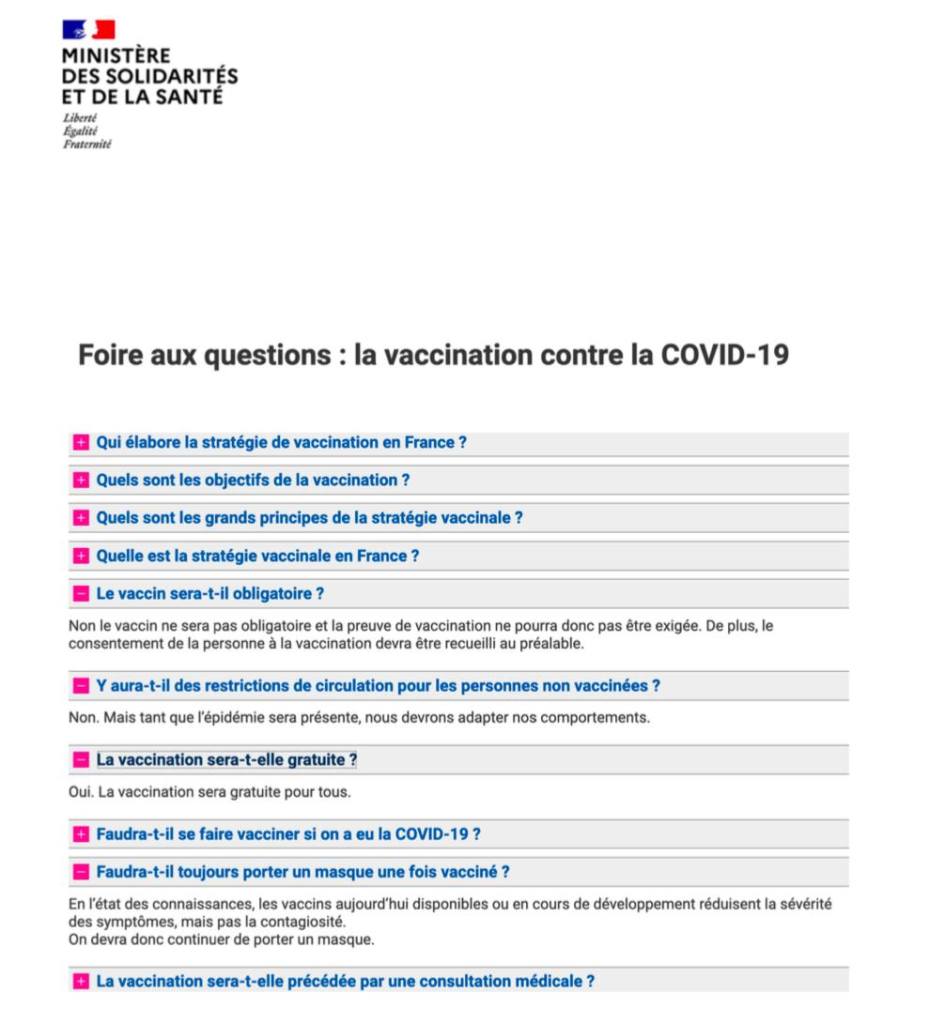 FAQ francesi: “Una volta vaccinato, dovrò continuare a portare la mascherina?”. Risposta: “Per quel che è dato sapere finora, il vaccino riduce i sintomi ma non la contagiosità. Quindi al momento sì, dovremo continuare a portare la mascherina”.