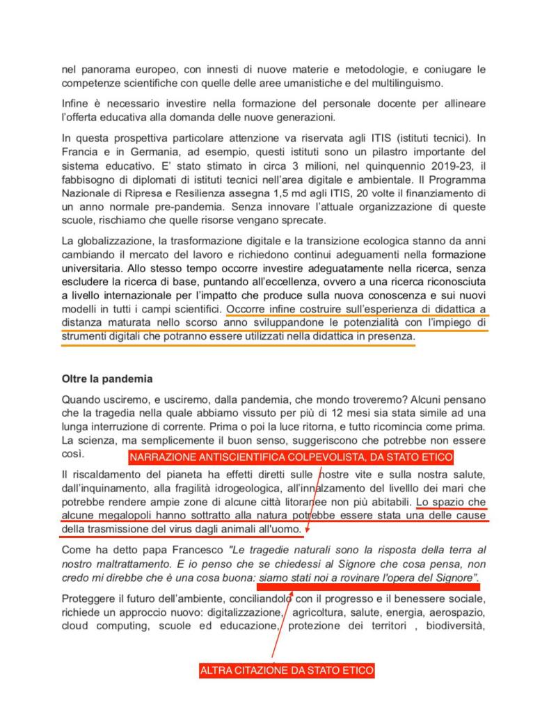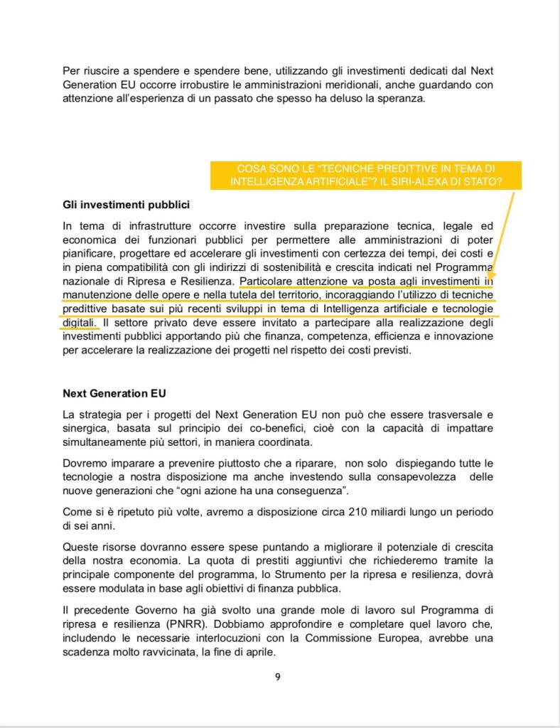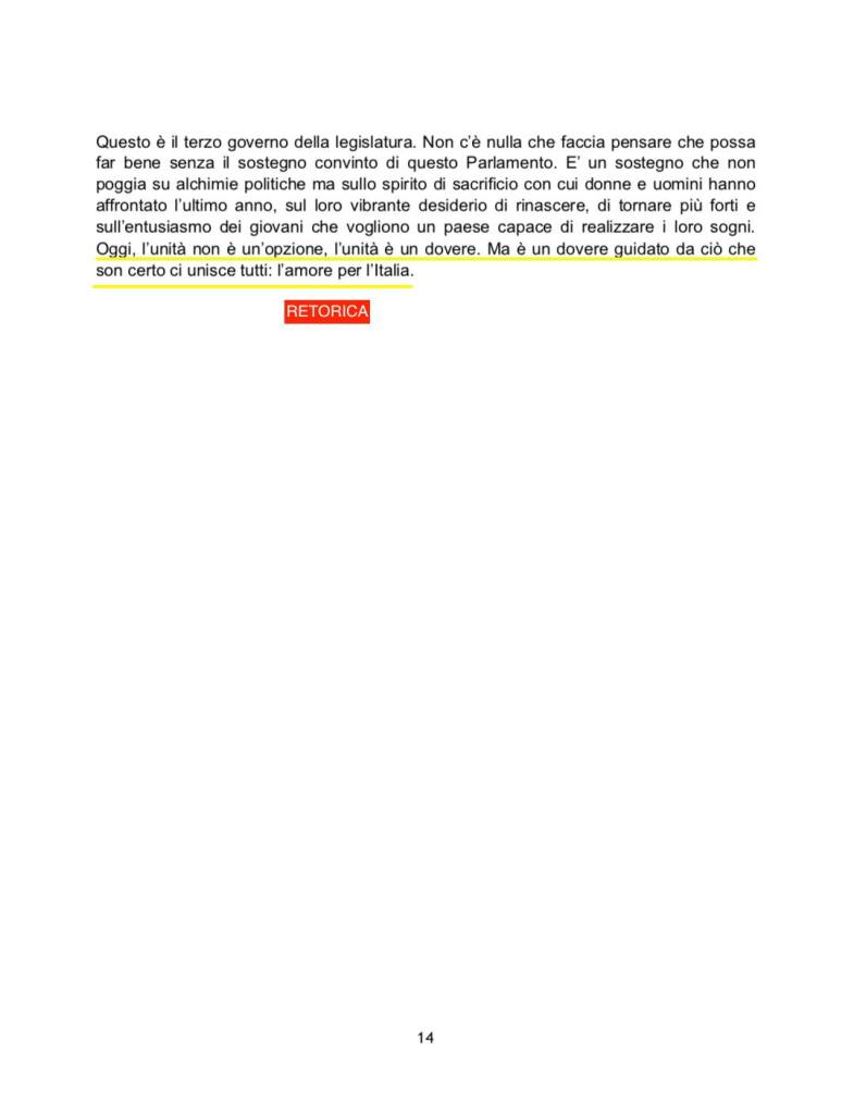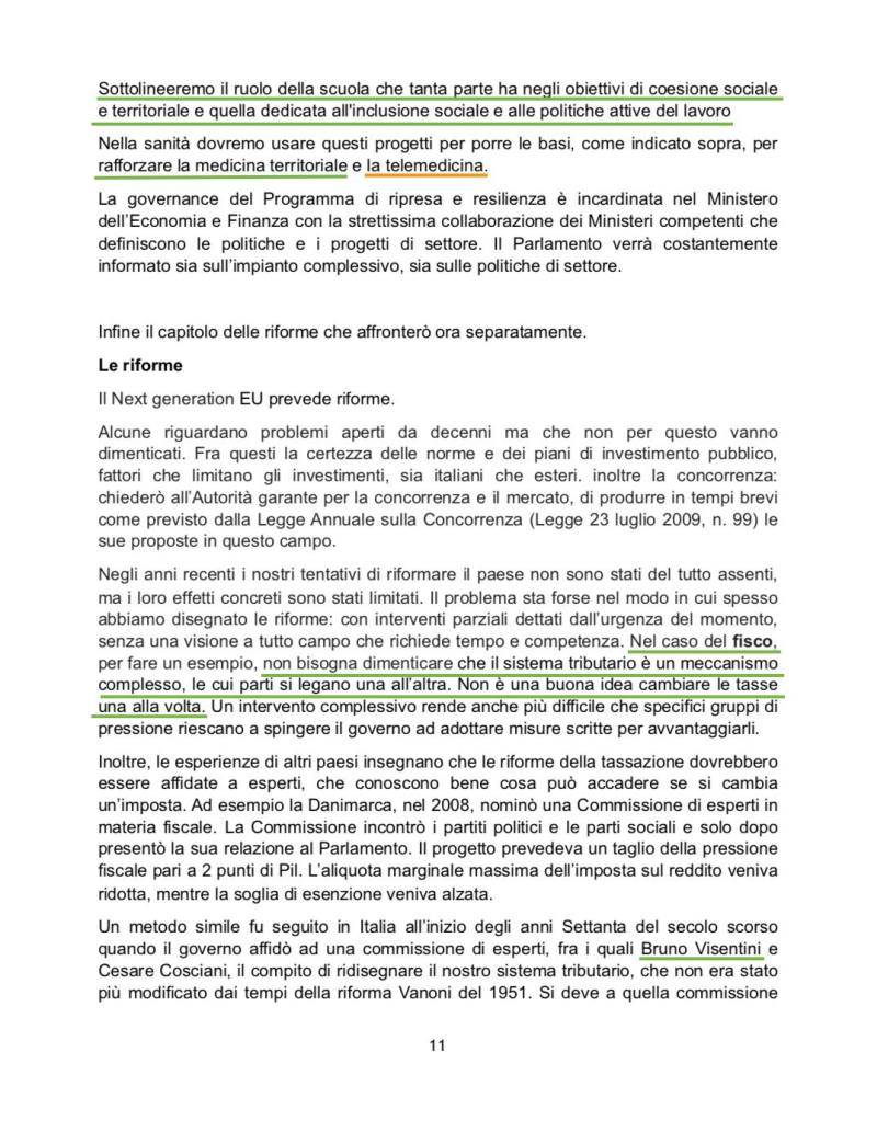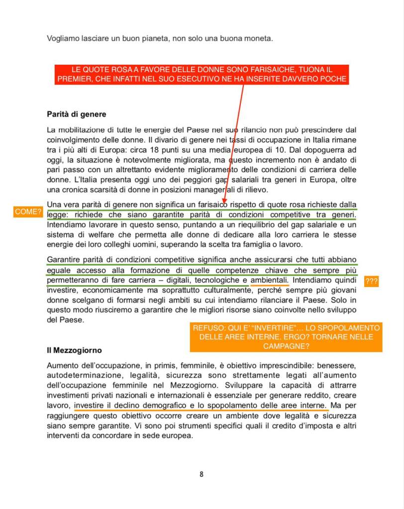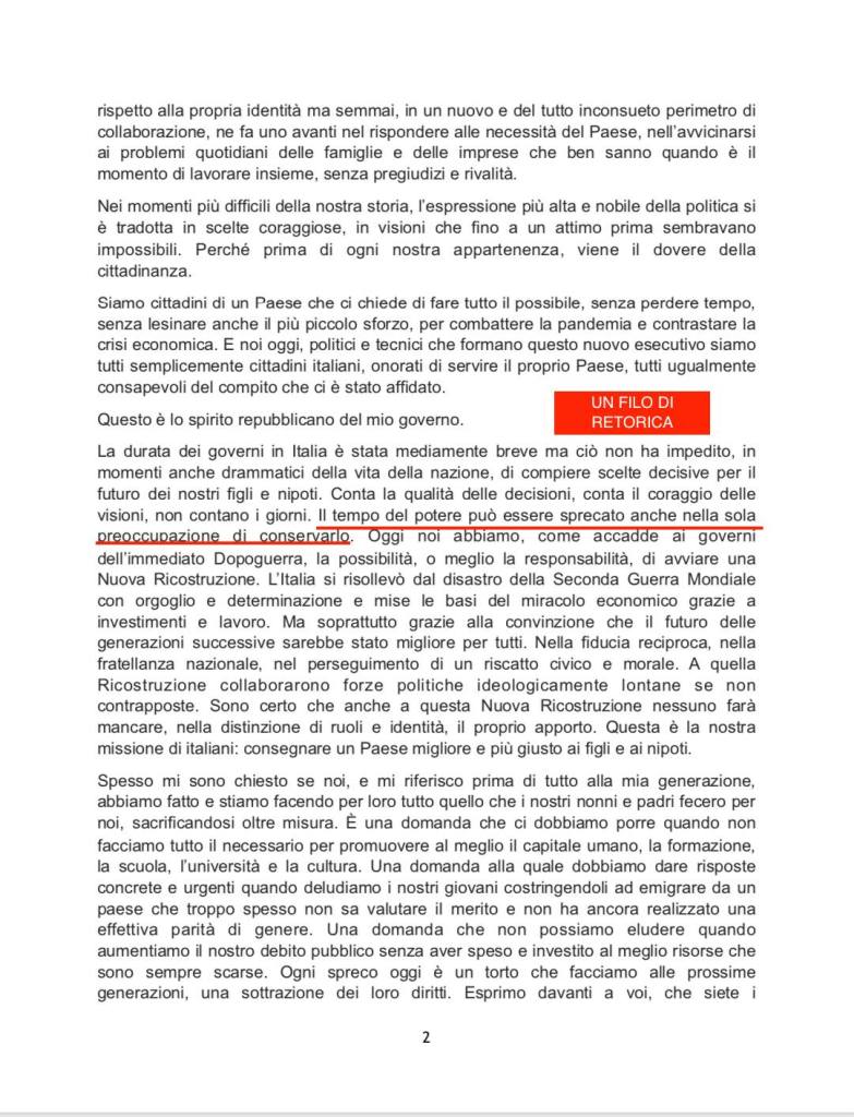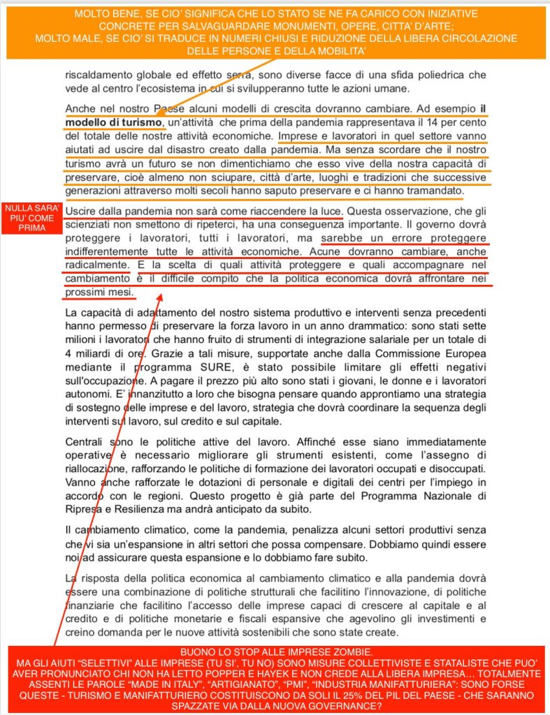 Un discorso sistemico, senza orizzonti temporali, con una visione ampia, di qui ai prossimi trent’anni. Un discorso che ha tratteggiato come dovranno (dovrebbero) essere le nostre vite fino al 2050. Vite diverse, senza tanti lavori che da oggi non esisteranno più: “Dovranno cambiare”. Vite “artificiali”, visto l'(ab)uso sistematico della parola “AI” (Artificial Intelligence). Vite senza la mobilità e il turismo cui eravamo abituati, quello della movida-che-schifo, che nell’anno 2019 a.C. produceva il 14% del Pil. Vite senza manifattura (11,9% del Pil), senza Made in Italy (7,3% del Pil), senza artigianalità, senza PMI (12,6% del Pil): parole totalmente assenti nel discorso programmatico del Premier, alle quali chiunque di noi si fosse affezionato dovrà rinunciare perché ormai antistoriche. Vite più green: è “colpa nostra se il Covid ha assalito l’uomo”, dice il Premier Etico. Vite più europee e meno Italiane: “Cedere sovranità nazionale per acquistare sovranità condivisa”. Vite intrise di politically correct: la parità di genere e le donne, i giovani, l’ambiente, la riforma della pubblica amministrazione guidata da chi non la conosce, la riforma della giustizia, il “fisco buono” che però deve sbrigarsi a smaltire le pratiche, l’europeismo, l’atlantismo e le “preoccupazioni” per Cina e Russia. La parola libertà ormai assente. Fine del Novecento.