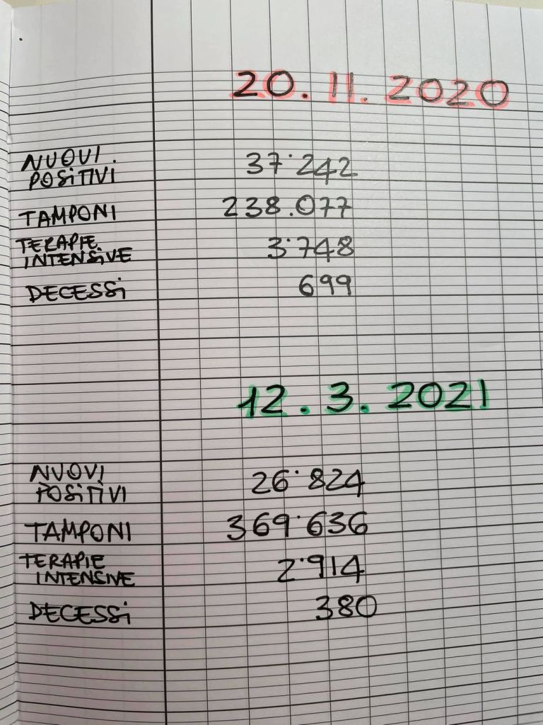 Chiudere adesso, a un anno da marzo 2020, con quasi il doppio dei tamponi e quasi la metà dei positivi e la metà dei decessi rispetto a novembre 2020, È UNA SCELTA POLITICA.