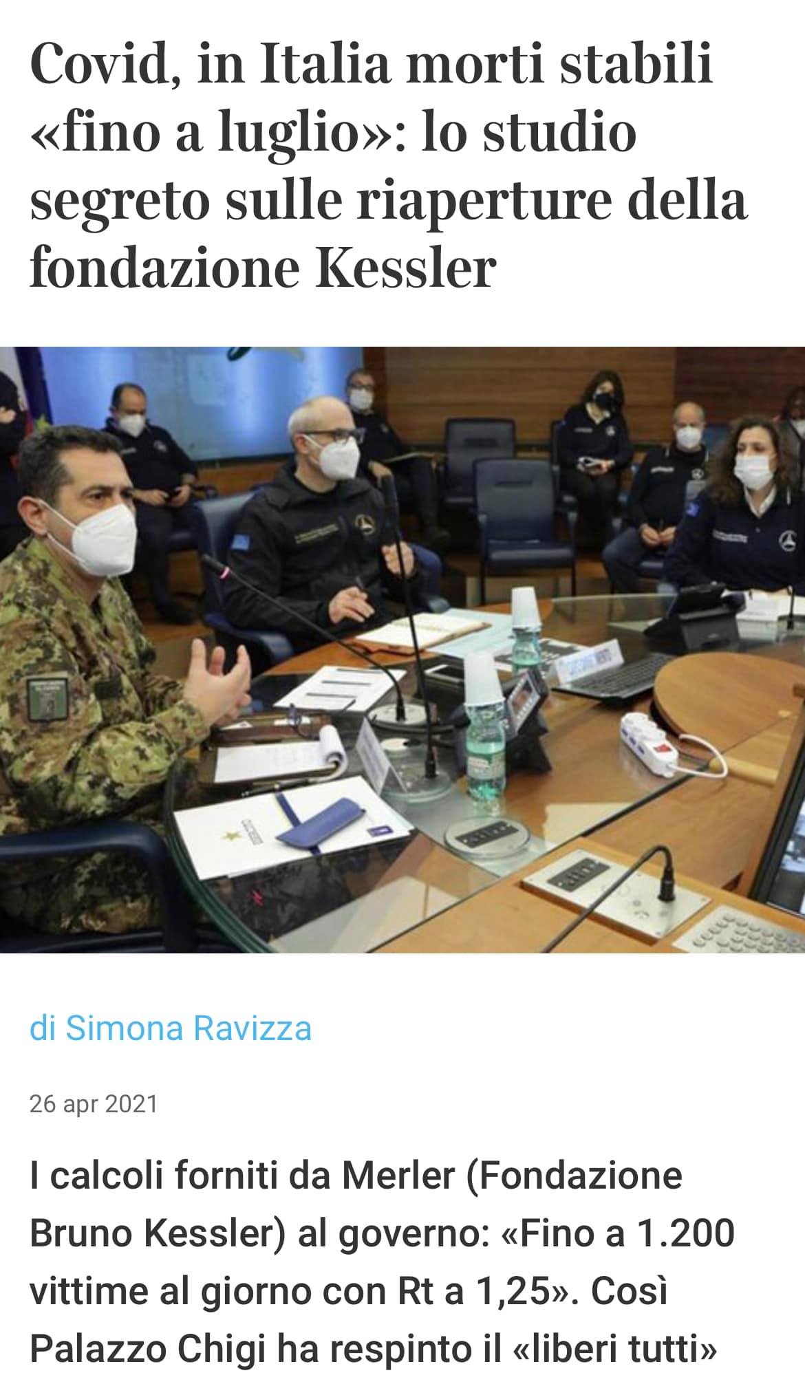 La Fondazione Kessler di Trento diretta da Stefano Merler, consulente del Governo, celebra l’anniversario con un’altra previsione apocalittica che affida ancora una volta al Corriere della Sera: entro luglio 2021 ci saranno dai 300 ai 1300 decessi al giorno dovuti alle riaperture. L’obiettivo, oggi come un anno fa, è continuare a far vivere e lavorare i cittadini in modalità lockdown. La modalità, oggi come allora, è usare modelli matematici predittivi – validi quanto le letture degli aruspici – anziché studi statistici ed epidemiologici, basati sui fatti e non su “previsioni”. Da questo Frate Indovino, consulente a contratto del Ministero della Salute, sono dipese le riaperture a metà del 2020 e del 2021, decise e imposte da Speranza.