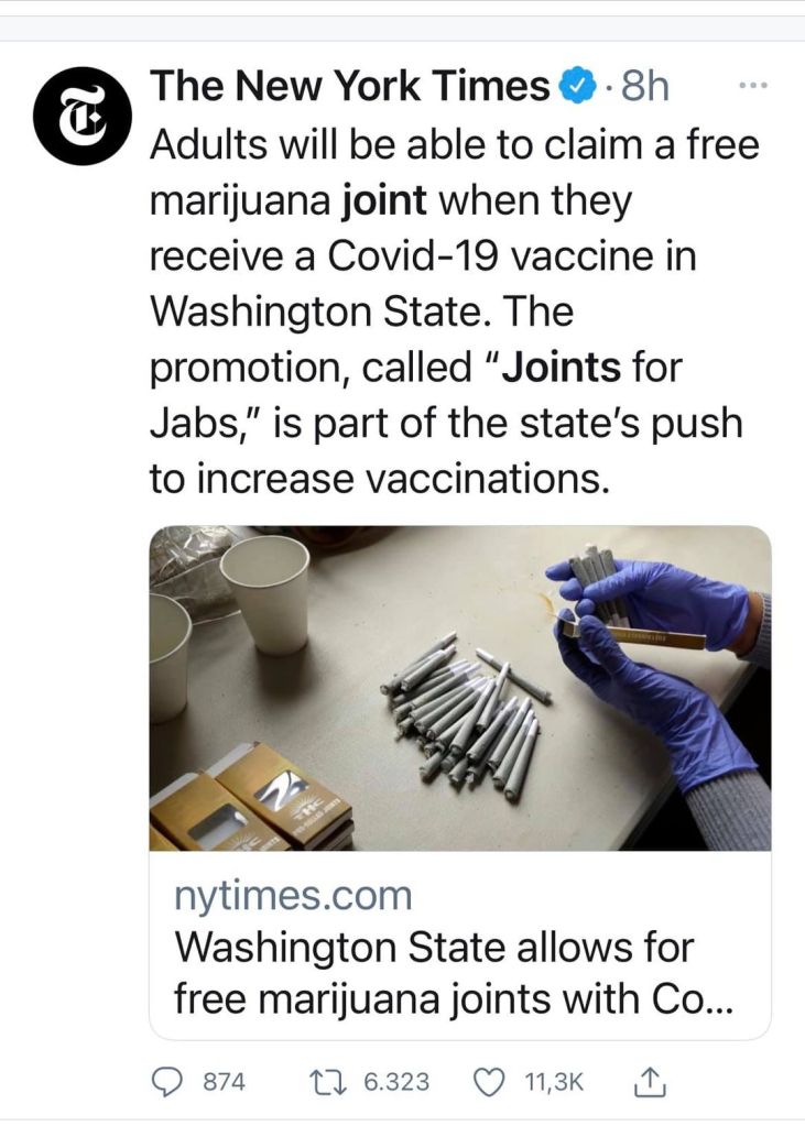 “Se ti vaccini avrai una canna gratis”: accade nello Stato di Washington, governato dall’esponente del Partito Democratico Jay Inslee.