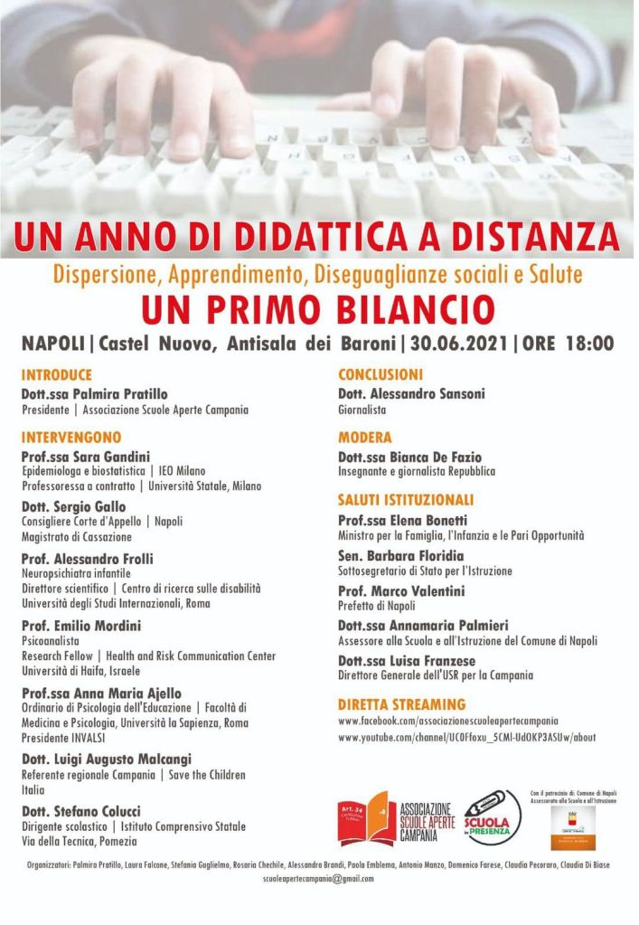 “A più di un anno dall’inizio della pandemia – spiega l’Associazione Scuole aperte Campania – e dopo un intero anno scolastico fortemente segnato dall’uso prolungato dell’insegnamento a distanza, ci siamo accorti che occorreva fare il punto della situazione su quanto tutto ciò abbia inciso sulla vita delle famiglie e dei ragazzi da vari punti di vista. E abbiamo inteso farlo chiamando a confrontarsi alcuni dei massimi esperti italiani di diritto, epidemiologia, dispersione scolastica, apprendimento, disturbi psicofisici e diseguaglianze sociali”.