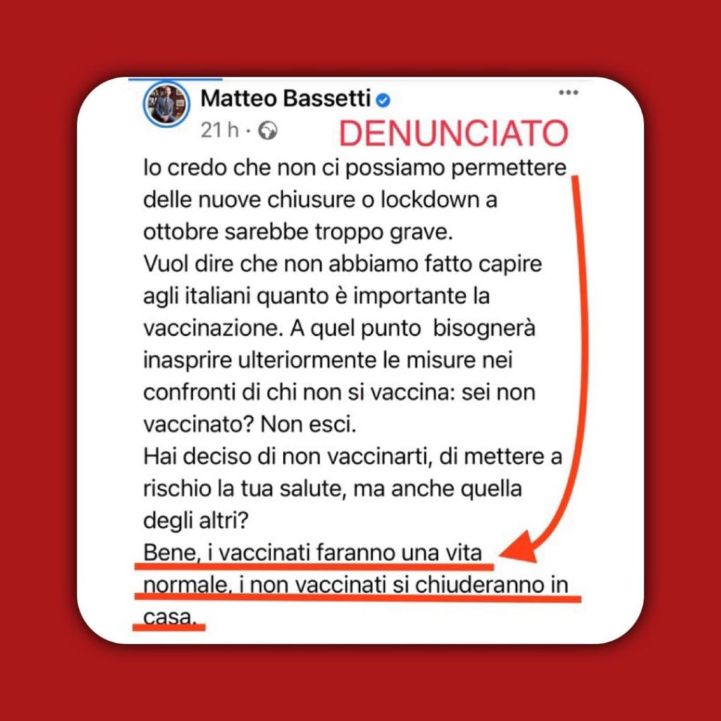 Questo post in cui Matteo Bassetti invoca lockdown per chi non si è vaccinato contro il Covid è stato giustamente segnalato a Facebook da migliaia di persone per istigazione alla discriminazione, violazione dei diritti costituzionali e dichiarazioni estremiste. Il dottorino si è anche beccato una denuncia alla magistratura e dovrà andare in tribunale a difendersi. Lui per tutta risposta ha impedito di commentare e ha cancellato i commenti contrari troppo popolari È stato letteralmente asfaltato, eppure si è messo in modalità Burioni: censura.