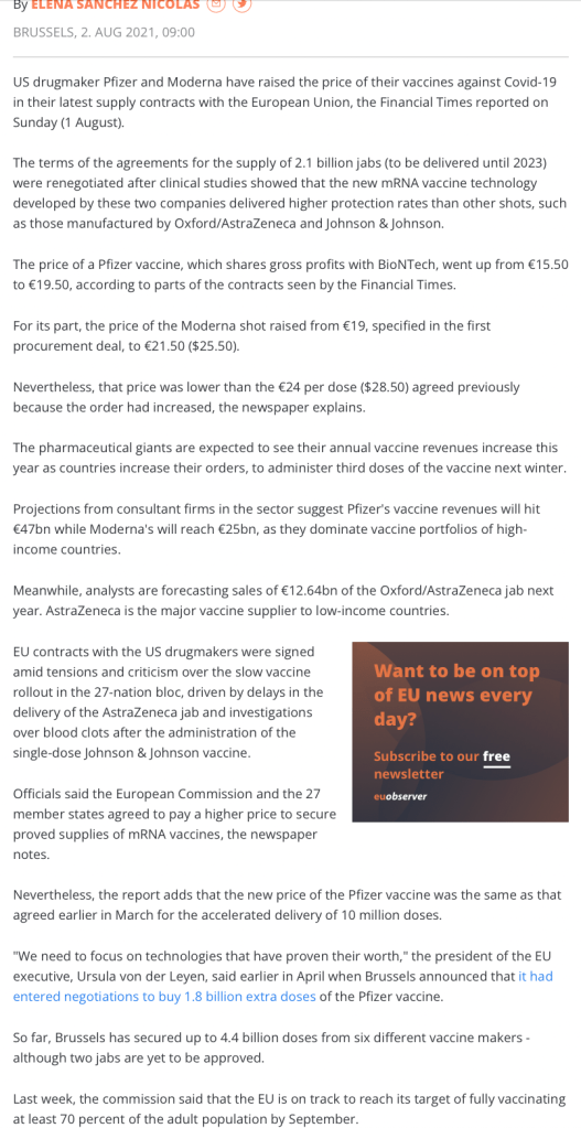 … e mentre la scienza annuncia che la variante Delta “buca il vaccino” (ossia protegge dai sintomi gravi e decessi ma non necessariamente da infezione e contagio), Pfizer e Moderna rinegoziano il prezzo per dose con l’Unione europea e lo aumentano a quasi 20 euro. Motivo: “I nostri vaccini proteggono di piu”