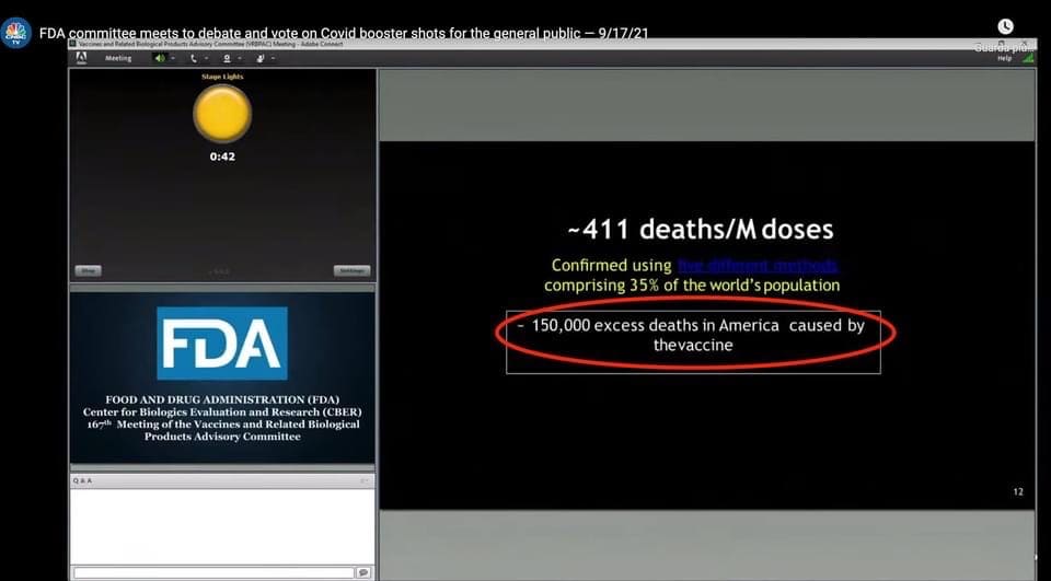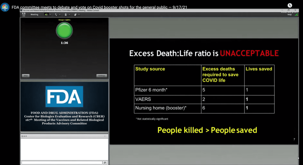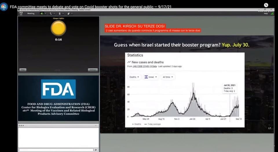Il 17 settembre alla Fda americana si è tenuto un Advisory Committee* sui vaccini. Il dibattito è durato 8 ore ed è pubblico, documentato dalla CNBC e facilmente reperibile a questo link ufficiale (https://www.youtube.com/watch?v=bQevYc2jX7Y). Gli esperti hanno votato 16-2 contro l’approvazione della terza dose. Alcuni (Steve Kirsch, executive director del Covid-19 Early Treatment Fund) hanno riferito alla FDA (ente governativo che regolamenta i prodotti alimentari e farmaceutici) che “i vaccini stanno uccidendo almeno 2 persone ogni vita salvata (“unacceptable”), che gli attacchi di cuore si verificano 71 volte più spesso, che ci sono 411 decessi per milione di dosi, che 1 ragazzo di 16-17 anni su 317 è colpito da miocardite da vaccino e se fa la terza dose il rischio miocardite sale a 1 ragazzo su 25″.