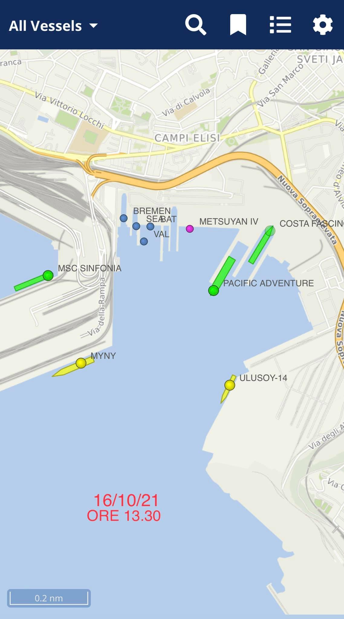 Come si vede nella mappa di Vessel Finder, ci sono soltanto due navi merci in tutta l’area commerciale del porto (pallino giallo, una delle due è turca, le navi turche caricano di notte), qualche peschereccio (pallino blu), navi da crociera (pallino verde, ma sono in manutenzione) e uno yacht in manutenzione (pallino rosa). Il carico di Formula 1 di ritorno dal Gran premio in Turchia è stato dirottato a Marsiglia.